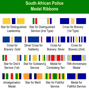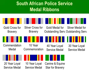 The South African Police Service, which was formed in 1994 by amalgamating the SAP and the police forces of the former homelands, used the SAP decorations and medals until 2004, when a new series of decorations was instituted: