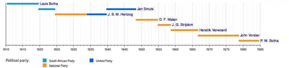 The prime minister of South Africa (Afrikaans: Eerste Minister van Suid-Afrika) was the head of government in South Africa between 1910 and 1984.