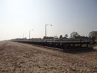 The plans called for a 180-foot-wide (55 m) beach to be built before the boardwalk, but construction did not progress in that exact sequence, which resulted in some parts of the boardwalk site being flooded at high tide. As a result, WPA employees sometimes worked 6-hour days and other times worked less than 4 hours in a day.[56] Nevertheless, the boardwalk was built relatively quickly, and the first 1-mile (1.6 km) section between Fort Wadsworth and South Beach was nearly completed by the end of 1936.[57] Twelve jetties and a parallel beach section had also been completed, though a section across New Creek in Midland Beach was progressing slowly.[55] By June 1937, the entire boardwalk was essentially completed.[58] An official opening ceremony was held on July 4, 1937, and was attended by 25,000 people. Upon its opening the boardwalk was named after U.S. president Franklin D. Roosevelt, who participated in the ceremonies remotely.[36][59][60]
