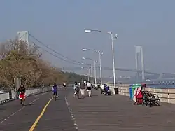 The first portion of the renovation was completed in 1958. When the project was entirely completed in the 1960s, it included three sections, the original South Beach as well as two new sections at Graham and Midland Beaches.[36] The renovation was performed in conjunction with the planning of what would become the Verrazzano-Narrows Bridge, which would provide Staten Island's first physical connection to the rest of New York City.[65] Close to $1 million for additional improvements to the South Beach–Franklin Delano Roosevelt Boardwalk was allocated in 1967,[68] and additional funds were disbursed under the Public Works Employment Act of 1977.[69]