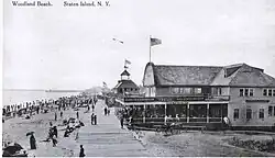 Staten Island's East Shore was originally settled by the Dutch, who created the modern-day neighborhoods of Midland Beach and South Beach.[7][24][25] Though summer homes were built along the beach in the mid-18th century, these areas remained rural until the later portion of the century. By 1882, businessmen realized that the area could be developed as a resort,[25] and amusements such as theaters, hotels, bathing pavilions, and casinos were added along the shore. In particular, two amusement parks were developed on the site of the modern-day boardwalk: Happyland Amusement Park and Midland Beach.[7][24] In 1884, opened the South Beach Branch of the Staten Island Railway, which in turn led to the Staten Island Ferry at St. George Terminal.[26] As a result of its easy accessibility from Brooklyn and Manhattan, the resorts evolved into amusement places similar to Coney Island. The sites of the amusement areas are now occupied by the South Beach–Franklin Delano Roosevelt Boardwalk.[25]