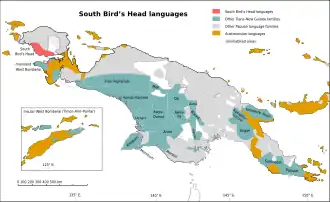 The South Bird's Head or South Doberai languages are three families of Papuan languages. They form part of the Trans–New Guinea languages in the classifications of Malcolm Ross (2005) and Timothy Usher (2020), though Pawley and Hammarström (2018) do not consider them to be part of Trans–New Guinea.[1] However, according to Dryer (2022), based on a preliminary quantitative analysis of data from the ASJP database, South Bird's Head languages are likely to be a subgroup of Trans–New Guinea.[2]
