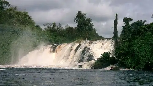 Numerous rivers run through the South Cameroon Plateau, particularly in the southeast. These bodies of water drain into both the Atlantic Ocean and the Congo River basin.[16] The rivers south of the Sanaga follow an equatorial regime; that is, they reach a high water point during the rainy seasons and a low point during the dry seasons.[17] There, rivers such as the Dja, Boumba, and Sangha have carved out valleys. The rivers flow slowly and experience seasonal flooding during the rainy season.[1]
