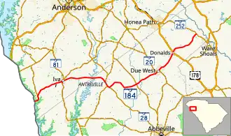 SC 184 begins at the Georgia state line, where the roadway crosses over the Savannah River and enters that state on the Sgt. Fred M. Newton Bridge as Georgia State Route 368 (Anderson Highway). It begins to travel through Anderson in an east-northeast direction and then curves to the north-northwest before an intersection with SC 187. It curves to the northeast and crosses over Little Generostee Creek before entering Iva. The highway turns right onto Hamilton Street. It has a concurrency with SC 81. At East Green Street, it meets the southern terminus of SC 413. The two highways travel concurrently to the southeast for one block, where SC 413 splits off onto East Front Street. SC 184 then travels to the northeast, leaves Iva, and crosses East Beards Creek. It starts heading east, and crosses over Lake Secession, into Abbeville County, on an unnamed bridge. It then travels through part of Lake Secession and curves to the southeast before entering Antreville. There, it begins a concurrency with SC 28/SC 284. Right after leaving the city limits, SC 284 leaves the concurrency. Approximately 2,000 feet (610 m) later, SC 184 splits off to the northeast and crosses over Spur Creek. It winds its way through rural areas of the county and crosses over Johnson Creek. A short distance later is an intersection with SC 201 and a crossing of the Little River. SC 184 crosses over Hogskin Creek and Chickasaw Creek before entering Due West. In town, it begins a concurrency with SC 20/SC 185 (Anderson Drive). The three highways pass by Erskine Theological Seminary and Erskine College. At College Street, SC 20/SC 185 splits off, while SC 184 continues to the northeast. In Donalds, it has a very brief concurrency with U.S. Route 178 (US 178). Farther to the northeast, it crosses over Turkey Creek before it meets its eastern terminus, an intersection with SC 252.[3][4]