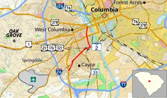 SC 2 is a 3.9-mile (6.3 km), two-lane road just southwest of Columbia, serving as a business route for Cayce. It begins at the US 21/US 176/US 321 concurrency heading northeast. It then takes a turn to the north and runs parallel to the Congaree River to its west. Shortly after passing US 1, the highway ends at US 378 in West Columbia. The highway runs by an elementary school, Brookland-Cayce High School, two shopping centers, and a park.[2]