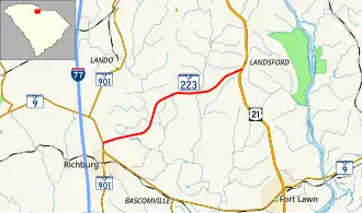 SC 223 is a two-lane rural highway that traverses from SC 9 and SC 901 north of Richburg to U.S. Route 21 (US 21) in the community of Landsford and Landsford Canal State Park.[2][3]