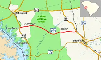SC 283 begins at an intersection with U.S. Route 221 (US 221)/SC 28 (Main Street) in Plum Branch, within McCormick County, where the roadway continues as Collier Street. It travels to the east and nearly immediately curves to the east-northeast before leaving the city limits. The highway curves back to the east and crosses over Stevens Creek. SC 283 goes back to the northeast and enters Whitetown. Just past the intersection with Upper Mill Road the highway enters Sumter National Forest. After it starts heading to the east-southeast, it crosses over Byrd Creek. After a crossing of Wine Creek, it crosses over Turkey Creek and enters Edgefield County. Just to the east of an intersection with North Martintown Road, which is south-southwest of Cleora, the highway leaves the national forest. Farther to the east, it meets its eastern terminus, an intersection with US 25, at a point northwest of Edgefield.[3]