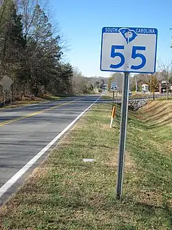 The current SC 55 was established in 1931 as a new primary routing from Kings Creek to Lake Wylie. The highway was fully paved by 1942. In 2012, SC 55 was widened with a median through Clover.[4]