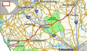 Leaving Greenwood, the route heads towards Clinton where it intersects with I-26. Passing the interstate, the route enters into the Sumter National Forest and passes through the small town of Whitmire. From Whitmire until just shy of its eastern terminus, SC 72 is cosigned with SC 121. The route exits the Sumter National Forest and bypasses Chester to the south. Once past Chester, the route turns more towards the north as it enters Rock Hill, where it terminates at SC 122 in the downtown area.[8]