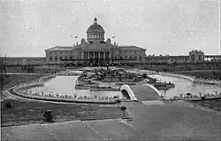 The fair and its grounds were divided into two areas: Nature and Art.[6] The focus of the exposition was the Cotton Palace, a 320-foot (98 m) long building with a 75-foot (23 m) tall dome. The other major buildings were the Palace of Commerce and the Palace of Agriculture.[5] The Woman's Building was in Wagener's Lowndes Grove house. The other major buildings were: Administration, Art, Auditorium, Fisheries, Machinery, Mines and Forestry, Negro, Transportation, and Women.[7]