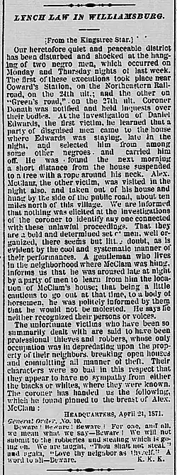 - ^ "Hanging of two negroes". Yorkville Enquirer. 1871-05-11. p. 2. Retrieved 2023-08-09.