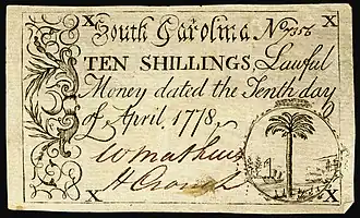 ![]() 10/– Colonial currency from South Carolina (April 10, 1778). | |