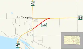 South Dakota Highway 249 (SD 249) is a state highway in the U.S. state of South Dakota that extends from SD 47 to SD 34 in Buffalo County. The entire highway is located within Fort Thompson and is maintained by the South Dakota Department of Transportation (SDDOT). It is not a part of the National Highway System.