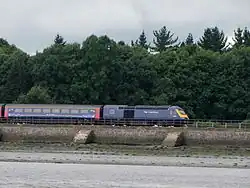 The South Devon Railway was built to the designs of Isambard Kingdom Brunel; it takes a route from Exeter which follows the River Exe to Dawlish Warren, runs beneath the sea cliffs to Teignmouth and then follows the River Teign to Newton Abbot. It follows tidal waters for about 13 miles (21 km), 4 miles (6.4 km) of which are open sea.