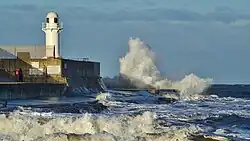 Near the end of the breakwater, in the fenced compound, there is a tall steel framed mast, housing air speed measurement devices. These devices gather data on wind speeds at various heights for a planned offshore wind farm proposed by Northern Offshore Wind Limited.[30] The mast is 164 feet (50 m) tall and 15.3 feet (4.7 m) wide at the base. Plans for the offshore wind farm include thirty 200 feet (61 m) windmills over 1 mile (1.6 km) offshore. AMEC Wind plans to build 19 wind turbines inside Corus steelworks generating 47.5 MW of electricity.[30]
