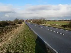 At the point where the railway crosses under the A1, is the corner of two other districts – Rutland and North Northamptonshire. The boundary with Rutland follows the east side of the A1. Since 1991, none of the A1 bypass is in South Kesteven. The boundary meets that of Great Casterton, and briefly follows the B1081 Ermine Street at Toll Bar. The boundary then follows that of Rutland, crossing the East Coast Main Line at Braceborough and Wilsthorpe and again at Carlby. At Castle Bytham, the boundary follows the east side of the A1, and crosses the A1 at South Witham, where a little further west is a corner with the district of Melton. The boundary follows that of Leicestershire along the former Sewstern Lane, which is now the Viking Way where it crosses the eastern end of Saltby Airfield. The boundary deviates from the Viking Way at Woolsthorpe-by-Belvoir where it briefly follows the River Devon. It crosses the A52 and railway at Sedgebrook. This area is part of the Vale of Belvoir. The boundary then passes through the former RAF Bottesford, where just north it meets the district of Newark and Sherwood (Staunton) at Three Shire Oak. The boundary crosses the A1 at Shire Bridge. It follows Shire Dyke at Claypole, crossing the East Coast Main Line, then briefly follows the River Witham. The north-west corner of the district is on the River Witham at Claypole just south of Barnby in the Willows. Further east, a two-mile section of the A17 skirts the district, just east of Byards Leap.