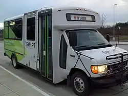 In 1993, following a city-sponsored contest to rename the transit system, the city council approved changing WART to SMART, or South Metro Area Rapid Transit. The first full-size buses were put into service later the same year.[4] Most service until then was dial-a-ride, door-to-door service. Following the acquisition of five used full-size buses, SMART introduced a new fixed route, 201, connecting Wilsonville with TriMet service at the regional agency's Tualatin Park-and-Ride lot and its Barbur Boulevard Transit Center, on November 1, 1993, and this was followed by the launching of a route to Oregon City (route 202), connecting with other TriMet routes there.[5] From 1999 to 2000, a lunchtime bus service was operated between businesses and the commercial center.[6]