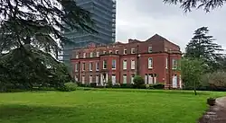 A charter dating from 990 relates to the manor of South Stoneham and during building works in the area immediately around the current house and grounds, archaeological evidence of a Saxon settlement was found.[2] The manor of South Stoneham was originally called Bishop's Stoneham, and was held by the Bishop of Winchester at the time of the Domesday Book. The original parish of South Stoneham covered more than 8,000 acres (32.37 km2; 12.50 sq mi), and extended along the eastern side of the River Itchen from the site of the present day Eastleigh in the north to just above Northam Bridge in the south, and from Swaythling to the outskirts of the original town of Southampton on the western side of the river; it included the tithings of Allington, Barton, Pollack, Shamblehurst, and Portswood. Other than St. Mary's Church (which is close to South Stoneham House but predates it considerably) and a few adjacent houses, there was no village of "South Stoneham"; the closest village to the house was Swaythling, now a suburb of Southampton.[3]