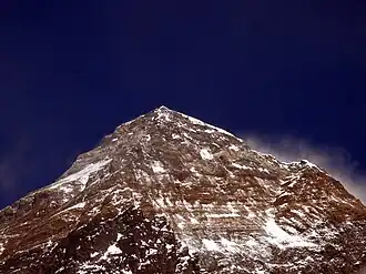 The South Summit is a popular place for Everest climbers to pause, change oxygen bottles, and turn around if necessary.[9] From this location the cornice traverse, Hillary Step, and summit can be seen in clear weather.[9]