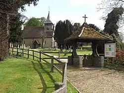 St. Andrew's church dates from the early 12th century and is a Grade II* listed building.[3] Its walls are made of flint rubble, except for the West wall of the nave and the 19th century South aisle. Its roofs are now tiled, though in the Middle Ages they may well have been thatched. The unusual wooden bell turret at the West end is late 14th century. Inside, the roofs of the nave and chancel are of the trussed-rafter type, used in mediaeval and late mediaeval times. In its original form the church had no South aisle, which was added by the Victorian architect Street about 1870. There were, however, nave altars on either side of the chancel steps as well as the main altar at the East end.