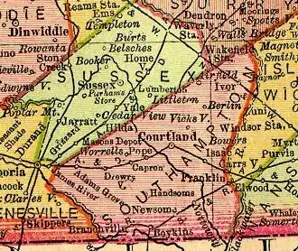 Southampton County from 1895 map of Virginia