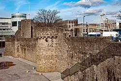 Little remains of the eastern walls, but in the north-east corner several towers still remain largely intact, including Polymond tower, a powerful drum tower largely reconstructed during the Victorian period.[70] Further west is the Bargate; this was originally a simple archway but was expanded with drum towers and arrow slits in the early 14th century, and then expanded again in the early 15th century with battlements and parapets, before being heavily restored in the 19th century.[71] The Bargate remains an elaborate building, taking military symbolism and combining it with rich civic heraldry and decoration above the gateway.[72]