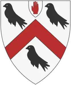 Argent, a chrevron engrailed gules between three Coots, a canton of a baronet