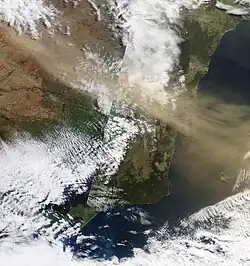Typically between 60 km/h (37 mph) to 70 km/h (43 mph), sometimes they may be brought on by a large polar air mass from the south-west of the continent in the Southern Ocean which moves east or north-eastward across Victoria towards the east coast.[9] Moreover, temperatures on the lee of the Great Dividing Range tend to rise substantially (due to a katabatic effect)[10] when cold fronts push warm and dry air from the desert across the country's eastern states and over the Range (this is generally followed by a southerly buster).[2][11]