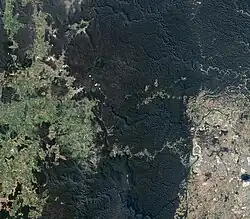 In September, when the foehn effect is usually strong, green pastures on the windward side (left, Central Tablelands) can be contrasted from the dry landscape on the leeward (right, Greater Western Sydney).