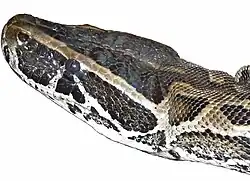 The Southern African rock python has a colouration that is similar to its northern relative, however it is described as being "drabber". Below the light stripe on both snakes' head, the southern species has a narrower dark patch that resembles a stripe instead of a patch. The Central African rock python (Python sebae) has two prominent light lines from the nose, over the eye to the back of the head, which are much duller in the Southern African rock python. The northern species has considerably larger head scales.[3][4] It is also noticeably inferior in size to size the Central African rock python.[4]