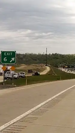 Construction began on February 17, 2014, with rock blasting on the unbuilt end of the US 22 interchange to begin building the bridge to carry the Southern Beltway over US 22,[25] while a formal groundbreaking with Governor Corbett and other state officials occurred on May 12, 2014.[26] Construction beyond the interchange began in January 2017 and would involve excavating underneath I-79 to allow the Southern Beltway to pass underneath that highway.[27] Work began on the 3.2-mile section of the highway between the Panhandle Trail and Cecil Reissing Road in Cecil in March 2017, a $90.6 million project.[28] By April 2021, most of the mainline paving and bridge work was complete, with finishing touches like road sign and toll gantry installation as well as line striping to take place in mid-2021. Completion of ramps to connect eastbound PA Turnpike 576 to southbound I-79 and northbound I-79 to westbound PA Turnpike 576 was planned to take place in mid-October 2021, with the remaining movements at the I-79 interchange to be completed by early 2022.[29] On October 9, 2021, a community day was held on a section of the roadway, with visitors allowed to walk or bicycle along the highway.[30] A ribbon-cutting ceremony for this segment was held on October 14, 2021, with state and local officials in attendance,[31] which opened to traffic the following day.[32] Construction of the remaining movements at the I-79 interchange was completed and opened to traffic on June 24, 2022.[33][34]