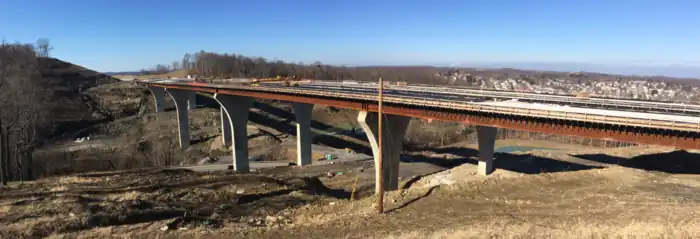 On December 21, 2012, the PTC announced that construction of a 13.2 mile section between US 22 and I-79 would proceed.[18] The initially projected completion date was for some time in 2021. Weather conditions and other delays pushed the probable completion date closer to the summer of 2022.[19]