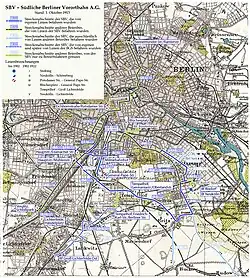 The company was founded on 4 July 1898 with a share capital of three million Mark (adjusted for purchasing power in today's currency: around 25 million euros). Half of the share capital was held by GBS, and the other half by the Gesellschaft für Elektrische Unternehmungen.[2] The company took over the contracts of the Südlichen Berliner Vorortbahn Konsortium, which had reached agreements with the municipalities of Britz, Lankwitz (whose municipal head, Friedrich Dillges, led the negotiations), Rixdorf, Schöneberg, Tempelhof, Treptow, and the city of Berlin. These municipalities were responsible for maintaining the railway line for the construction of a small railway. The approval contract for the city of Berlin was concluded until 31 December 1919, while the contracts for the other municipalities were valid until 1 July 1947. The state concession to operate the railway was issued until 1948.[3] The operator was required to pay eight percent of the gross income to the city of Berlin each year, and if the net income exceeded six percent of the capital invested, half of the additional amount. No charges were to be paid to the other municipalities for the first five years. An annual payment of 70 Pfennig per kilometre of single track was to be made to the municipality of Rixdorf, and 20 Pfennig per kilometre to the other municipalities for pavement maintenance. SBV started the first construction phase between Britz and Tempelhof in November 1898. Operations began on 1 July 1899 on two lines. As with the GBS, these were marked with different coloured signal boards.[4][1]