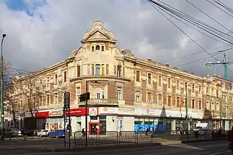 The building's architecture is striking, featuring a rectangular layout and distinctive Secessionist elements like floral motifs and geometric designs.[3] A triangular pediment crowns the main entrance, while a tower with a balcony marks the corner of the structure.