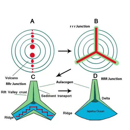 The Southern Oklahoma Aulacogen formed sometime in the Late Proterozoic Eon, between 525 and 550 million years ago,[9] during the rifting of the Laurentia supercontinent or North American Craton, the geological core of North America. Its formation and bimodal igneous activity occurred simultaneously, with two definite episodes of magma activity, mafic and felsic, the former of which being chiefly composed of gabbro-heavy magma and the latter phase being primarily composed of rhyolitic magma. It is hypothesized that between the mafic and felsic stages of magmatic activity substantial uplift occurred, which correlates to the lack of coarse-grained massif anorthosites presented previously.[2] The remaining two arms of its original triple-junction became spreading zones for the nascent Iapetus Ocean. The aulacogen penetrated the craton, causing normal faults to form in what became the Anadarko Basin.[5]
