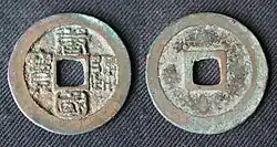 - ^ In Clerical (Li) script. Distinguished from Tang dynasty period Kaiyuan Tongbao cash coins (Hartill #14.1 &c) by the broader rims, and the characters being in less deep relief. Reverse: Plain.