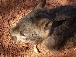 The southern hairy-nosed wombat is adapted to digging; it has a stocky and robust build, flattened claws, and five digits.[8] It is also plantigrade. The body length ranges from 772 to 934 mm (30.4 to 36.8 in) with a body mass ranging from 19 to 32 kg (42 to 71 lb).[8] Its short tail is hidden by its fur. The pelage is silky and is typically greyish or tan in colour. The wombat grooms itself with its second and third toes, which are fused together, except at the tips.[9][10] The head is robust and flattened and the ears are pointed.[11] The snout resembles that of a pig.[9] The animal gets its name from the hairs that cover its rhinarium.[8] The wombat's incisors resemble those of rodents, and its molars are widely spaced by the palate.[9] The teeth keep growing for the entirety of the animal's life, which is likely an adaptation to its harsh diet.[8] Compared to the common wombat, the southern hairy-nosed wombat has a larger temporalis muscle and a smaller masseter muscle.[12] Also, unlike the northern hairy-nosed wombat, the southern hairy-nosed wombat's nasal bone is longer than the frontal bone.[8]