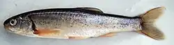 Adult size of southern leatherside chub varies between 10 and 110 mm (0.39 and 4.33 in) standard length.[6] The body is covered with very small scales over a skin with a leathery texture, inspiring the common name.[7] Overall coloration is bluish dorsally and silver ventrally; males are distinguished by patches of orange-red color on the axils of the paired fins, at the base of the anal fin, and along the lower lobe of the caudal fin, as well as golden-red specks at the upper end of the gill opening, and between eye and upper jaw. Unlike most other minnows, both dorsal and anal fins have eight rays.[7][4] This species also exhibits a fusiform body shape with forked homocercal caudal fins. Although southern and northern leatherside chub are similar, the rostrum of the southern leatherside chub comes to a more defined point than the northern leatherside chub.[2]