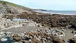 The 153 hectares (380 acres) stretch of shore, cliff, cliff-top, and several short, steep valleys, are designated an SSSI for their geological and botanical value.[2] The cliffs expose the Jurassic geological strata and some of the underlying Carboniferous Limestone, the latter dating from between 359 and c. 330 million years ago. By the Triassic period, 200 million years ago, the Carboniferous rocks had already been tilted and eroded.[2] A new deposition phase created more sedimentary rocks, including a red Triassic conglomerate, and a creamy white Jurassic limestone known as Sutton Stone, a freestone much sought-after for carved stonework, and so widely quarried where it occurs.[1] The SSSI is in two parts. The northern section is the wave-cut platform alongside Ogmore-by-Sea. The southern section, with a short gap, covers both the intertidal areas and the cliffs and grassy cliff-tops of Dunraven Bay, Trwyn y Witch headland and the valleys and shoreline of Cwm Mawr and Cwm Bach.[2] The whole length of the SSSI is traversed by the South Wales section of the Wales Coast Path.[3]