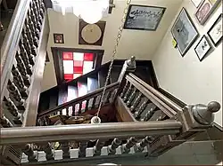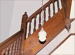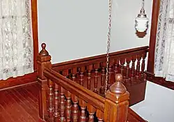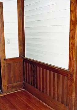 The first floor interior of the house is composed of five rooms. From the front door one enters the main entry hall, which contains the stairway balustrade that leads to the second floor. From the foyer one can enter the main parlor via a door on the right. The parlor contains a fireplace (and functional chimney) with a mantle and brightly colored tiles arranged in a complex non-repeating geometrical pattern. A pair of very large wooden double-doors (that slide into pockets) separate the first parlor from the second parlor. The second parlor has one door which leads to a wrap-around exterior covered porch and another door that leads to a formal dining room. The dining room is completely lined with tongue and groove beaded boards (ceiling and walls) with wainscoting that wraps around all four walls. The dining room then leads to a small kitchen. The kitchen has a door that opens to the wrap-around exterior covered porch. The staircase in the main entry hall leads upstairs to the second floor, which is composed of three bedrooms, a small closet, a small bathroom, and a large hallway with a balustrade surrounding the stairwell. From the hallway, a large window opens onto a small exterior balcony.