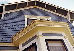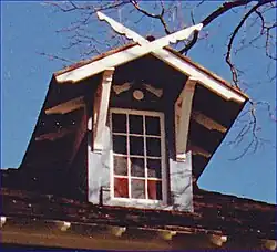 The National Register of Historic Places describes the architectural style as "High Victorian" Gothic Revival. The house has projecting eaves and gables and a prominent front bay with a denticulated cornice. The siding and trim are unusually ornate and varied. A continuous band of vertical siding at the base of the structure is capped with a horizontal band at the window sill. Drop siding occurs up to the sills of the second-story windows, above which multiple rows of fish-scale and rectangular shingles alternate. Ornamental bargeboard trim with brackets is located at the eave line, and the roof is wood shingle. Two brick chimneys rise far above the cedar shake roof. A dormer on the west elevation has diagonal support brackets for the overhang and crossed bargeboard trim.[17] There are 22 double-hung windows.