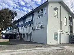 Some changes to the surviving 1950s buildings have been made. Alterations to Block E were made in 1988–9 reconfiguring the upper level layout to three classrooms and converting the then science laboratories to general classrooms, and refurbishing the ground floor drama room (former student recreation area).[76][77][78][79] In 2001 the lower level of Block E was reconfigured for a multi-media room.[80] Changes to Block B in 2001 included creation of computer labs (former commercial room and classroom) on the upper level, new aluminium windows, and the replacement of two doors. In 2012 a concrete switchback ramp for disabled access was added in the NE corner of Block B.[80][81] The brick walls and concrete plinths of the lower levels of both Blocks B and E have been painted.[1]