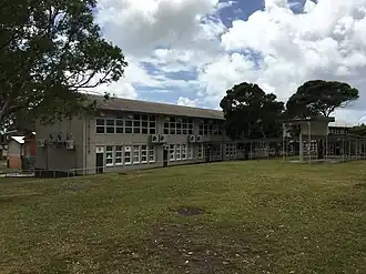 With the addition of Block F, a parade ground was formed to the southeast of Block E, providing a formal assembly space for the growing school.[68] Other ground improvements at Southport SHS in the 1960s included tennis courts, at the northern end of the grounds by October 1960; and a school oval with perimeter plantings to the east of the school buildings by June 1964, to the immediate south of land that had been resumed in July 1961.[69][67][70] Further resumptions (1974) and closure of Worendo Street (1975) brought the school grounds to a total of 13.44ha (33.2ac).[71][72][73] Although more high schools were built on the Gold Coast as its permanent population continued to increase - Miami SHS (1963), Palm Beach-Currumbin SHS (1972), Keebra Park SHS in Southport (1973) and Merrimac SHS (1979) - Southport SHS continued to expand to meet secondary education needs in the region. By 1980, 14 teaching buildings plus an assembly hall and sporting facilities (tennis and basketball courts, sports oval) populated the site, radiating in an organic manner to the northeast and northwest from the original buildings.[74] A principal's residence, onsite by 10 June 1964, stood in the northwest corner of the grounds.[75][1]
