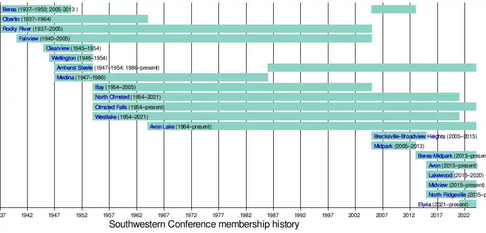 - Avon High School was approved to join the SWC in 2015-16 to accommodate the Berea-Midpark merger.[6]
