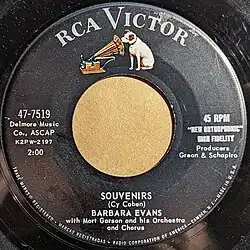 "Souvenirs" is a song written by Cy Coben[2] and originally recorded and released by American singer Barbara Evans backed by Canadian composer Mort Garson and his Orchestra, the song was released in April 1959. The song failed to chart, peaking at 111 in the Bubbling Under Hot 100 in June 1959. Two successful non-English covers would follow, such as in German by expatriate American singer Bill Ramsey in June of that same year (peaking at Number 1 in West Germany in September 1959), and the most successful in French by French singer Johnny Hallyday, released in June 1960.