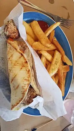 Souvlaki-pita consists of grilled souvlaki meat folded in a lightly grilled pita along with sliced tomatoes and onions, and tzatziki sauce,[18] and fried potatoes on the side – though increasingly they may be added to the folded pita. This variation is prominent at outlets run by Melbourne's Greek-Australian community.
