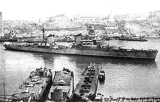Voroshilov was withdrawn from active operations, however, after the loss of three destroyers that were attempting to interdict the German evacuation of the Taman Bridgehead to air attack on 6 October 1943. This loss caused Stalin to forbid the deployment of large naval units without his express permission which was not granted during the rest of the war.[12] The ship was transferred to Novorossiysk on 18 August 1944 and to Sevastopol on 5 November.[7] She was awarded the Order of the Red Banner on 8 July 1945.[13]