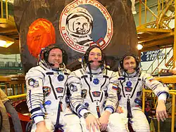 ![]() From left to right: Garan, Samokutyayev and Borisenko in front their Soyuz TMA-21 spacecraft dubbed "Gagarin" Soyuz programme (Crewed missions) | |