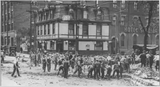 The Spadina Hotel was one of the names of the hotels operated at 460 King Street West, in Toronto, at the corner of Spadina Avenue and King Street.[1][2][3][4] The hotel was built in late 1873, the three storey Victorian building featuring a small clock on the east facade. A four-storey annex was later built to the north of the hotel. It has been known by at least half dozen names, and has had many proprietors. It is now a commercial office building including a programming school.