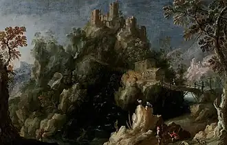 Looking back at their inventories, we can see that this genre of painting was highly appreciated by the art collectors of the time; however, as collectors did not usually record the names of painters, it is not possible to know how many in these collections were produced by Spanish artists, or how many were imported.[14] In contrast to Dutch Golden Age painting, there weren't authentic specialists in landscape painting in Spain, with the possible exception of the Basque painter Ignacio de Iriarte, who worked in Seville and associated with Bartolomé Esteban Murillo. Other painters, such as Francisco Collantes and Benito Manuel Agüero, who worked in Madrid, as well as Antonio del Castillo, from Cordoba, have also been praised for their landscape paintings.[15]
